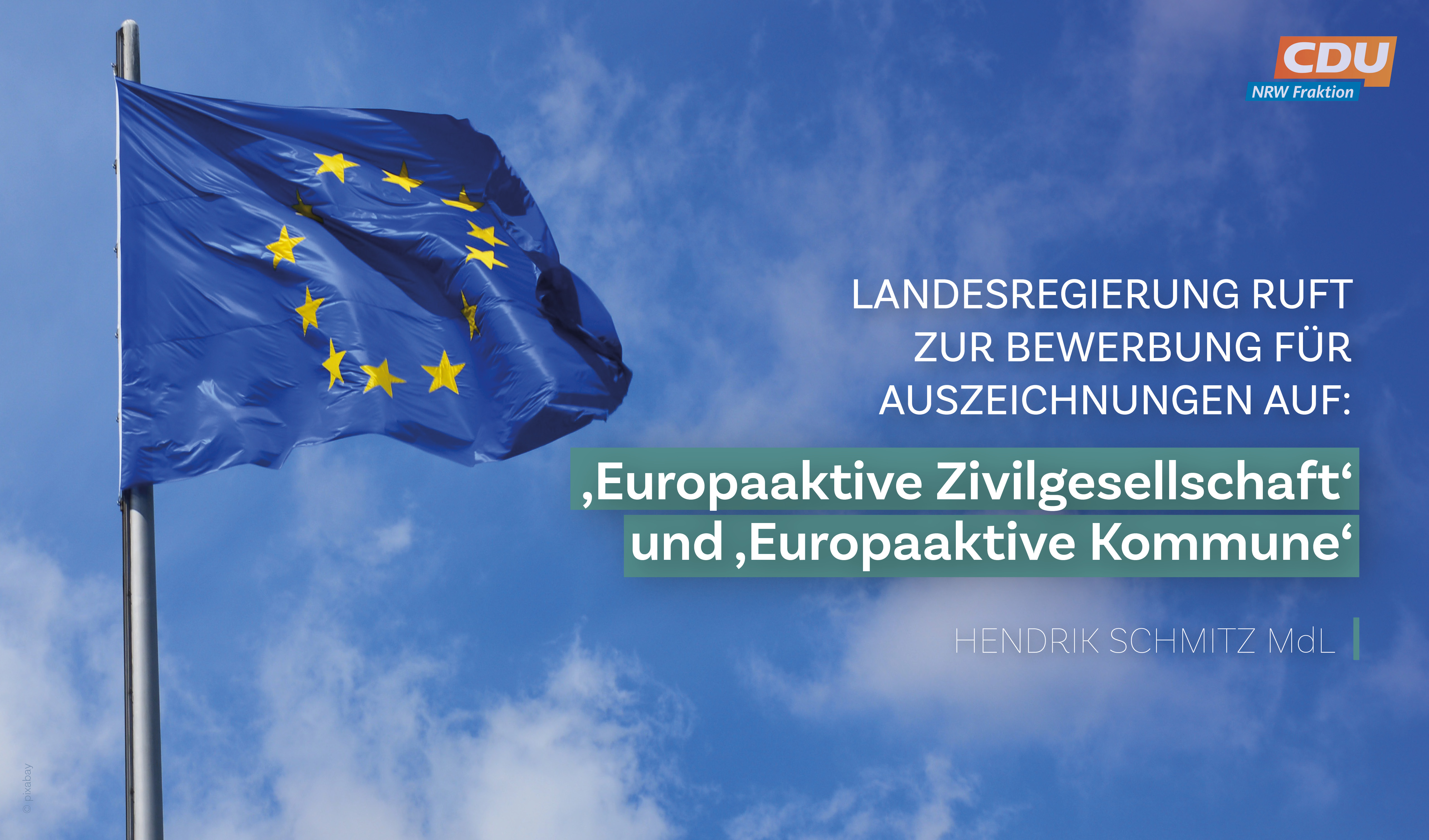 Der CDU-geführten Landesregierung ist das europäische Engagement der Kommunen und der Zivilgesellschaft außerordentlich wichtig. Mit der Auszeichnung „Europaaktive Kommune“ und der 2018 geschaffenen Auszeichnung „Europaaktive Zivilgesellschaft“ soll dies geehrt, unterstützt und motiviert werden, teilt Hendrik Schmitz, CDU-Landtagsabgeordneter für das Aachener Land, mit: