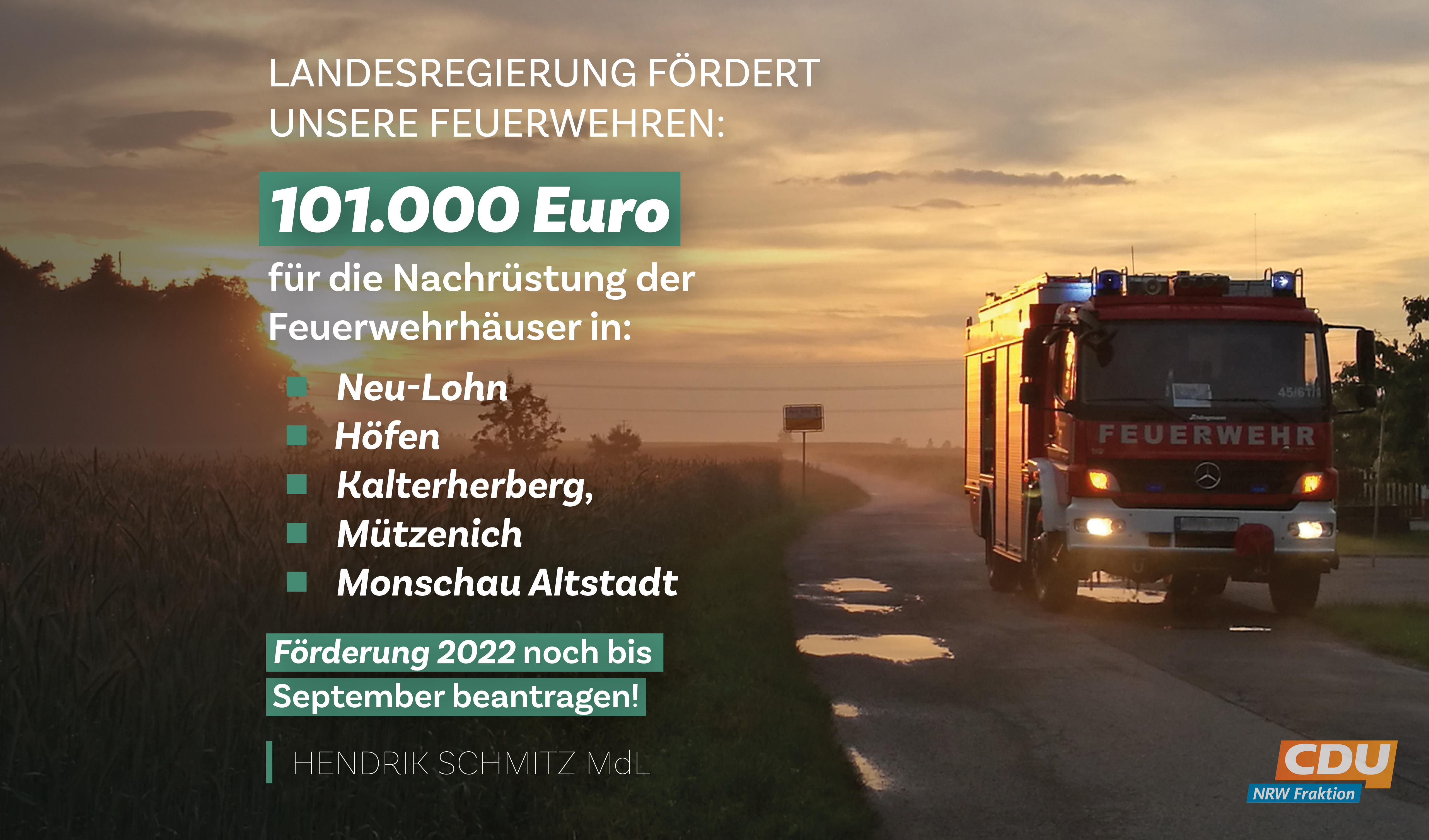 „Ohne unsere freiwillig Feuerwehr wird’s brandgefährlich. In Nordrhein-Westfalen sorgen mehr als 80.000 ehrenamtliche und mehr als 13.000 hauptamtliche Feuerwehrleute dafür, dass wir nachts ruhig schlafen können. Ihnen gebührt unser Respekt und unsere Dankbarkeit. Aber die CDU-geführte NRW-Koalition belässt es nicht bei schönen Worten, sondern will mehr tun. Denn wir investieren in die Feuerwehrhäuser. In diesem Jahr profitiert u.a. davon die freiwilligen Feuerwehren in Monschau und Eschweiler.