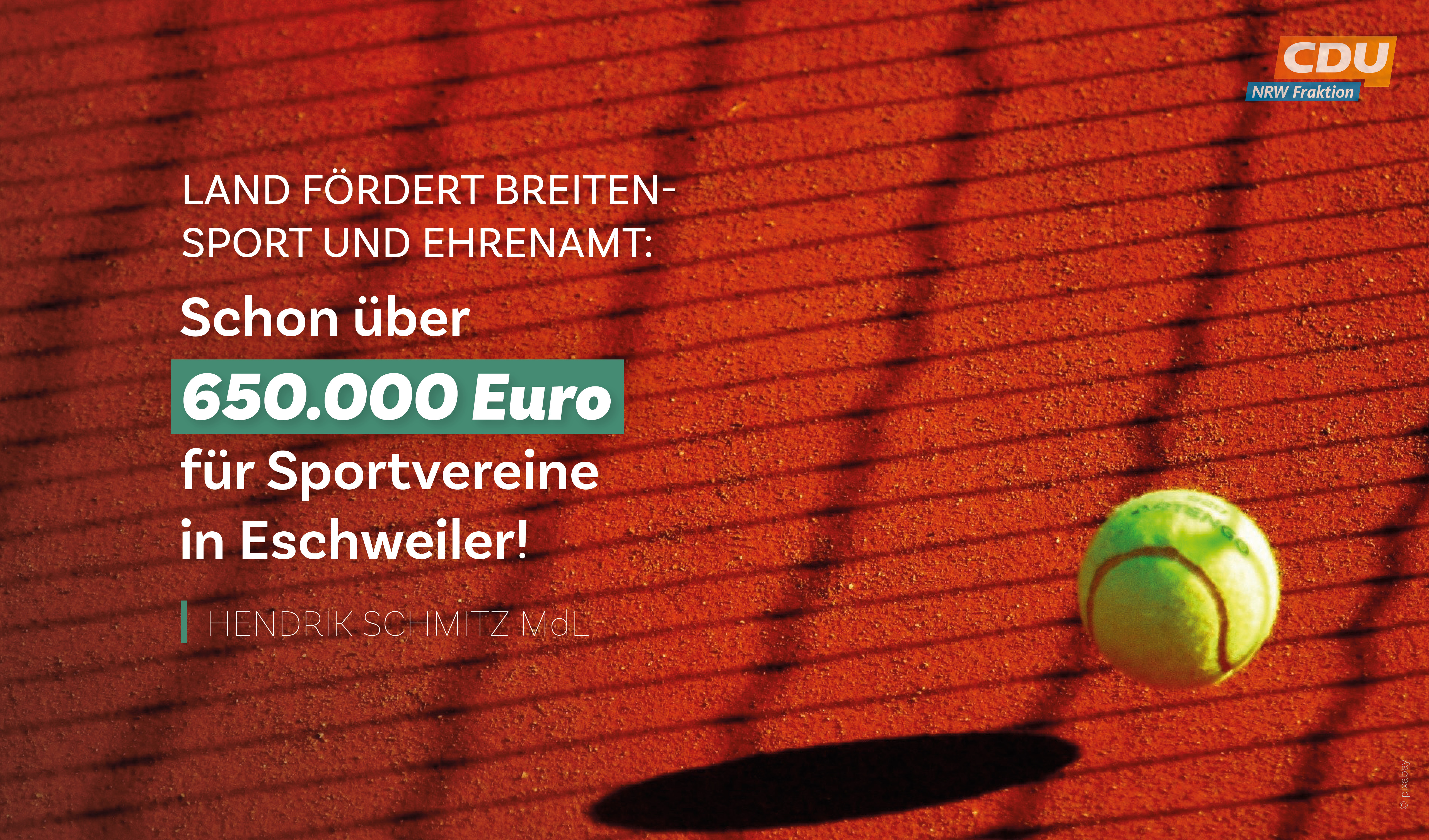 Letztes Jahr erhielt der Eschweiler Tennisclub Blau-Gelb 33.941 EUR aus dem Landesprogramm „Moderne Sportstätte 2022“, um in seiner Anlage in Dürwiß einen Minicourt mit Ballwand neuzubauen.  Nun profitiert er ein zweites Mal, teilt der CDU-Landtagsabgeordnete Hendrik Schmitz mit: