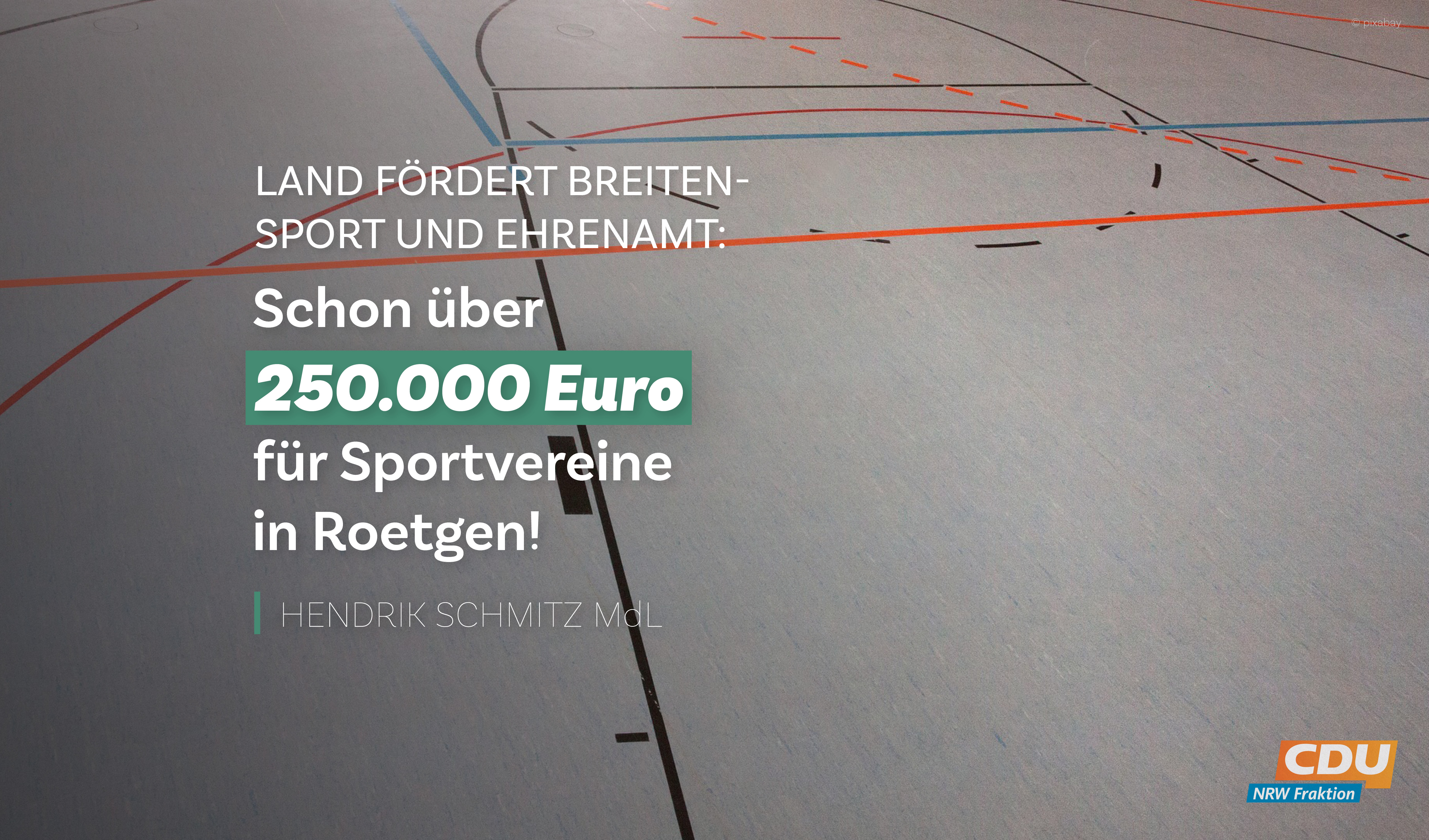 Vor zwei Jahren erhielt der der TV Roetgen 1894 150.025 Euro aus dem Sportstättenförderprogramms „Moderne Sportstätte 2022“, um den Schwingboden in seiner Sporthalle an der Rosentalstraße zu modernisieren.  Jetzt kommen weitere 45.749 EUR Fördermittel für den Austausch der Brandschutztüren sowie den Außen- und Innenanstrich hinzu. Damit wird das Roetgener Zentrum zu einer attraktiven Heimat für Sportler und Ehrenamtler mit modernen Sportstätten. Denn auch die benachbarten Anlagen des FC Roetgen 1913 und des Tennisclubs Roetgen 1972 können dank dieser Landeshilfe erneuert werden.  Insgesamt fließen mehr als eine Viertel Mio. EUR aus dem Landesprogramm „Moderne Sportstätte 2022“ nach Roetgen. Noch nie konnten so viele Sportstätten in ganz NRW mit so viel Geld in so kurzer Zeit auf den neuesten Stand gebracht. Eine wichtige Unterstützung für den ehrenamtlichen Sport in diesen schwierigen Zeiten!“